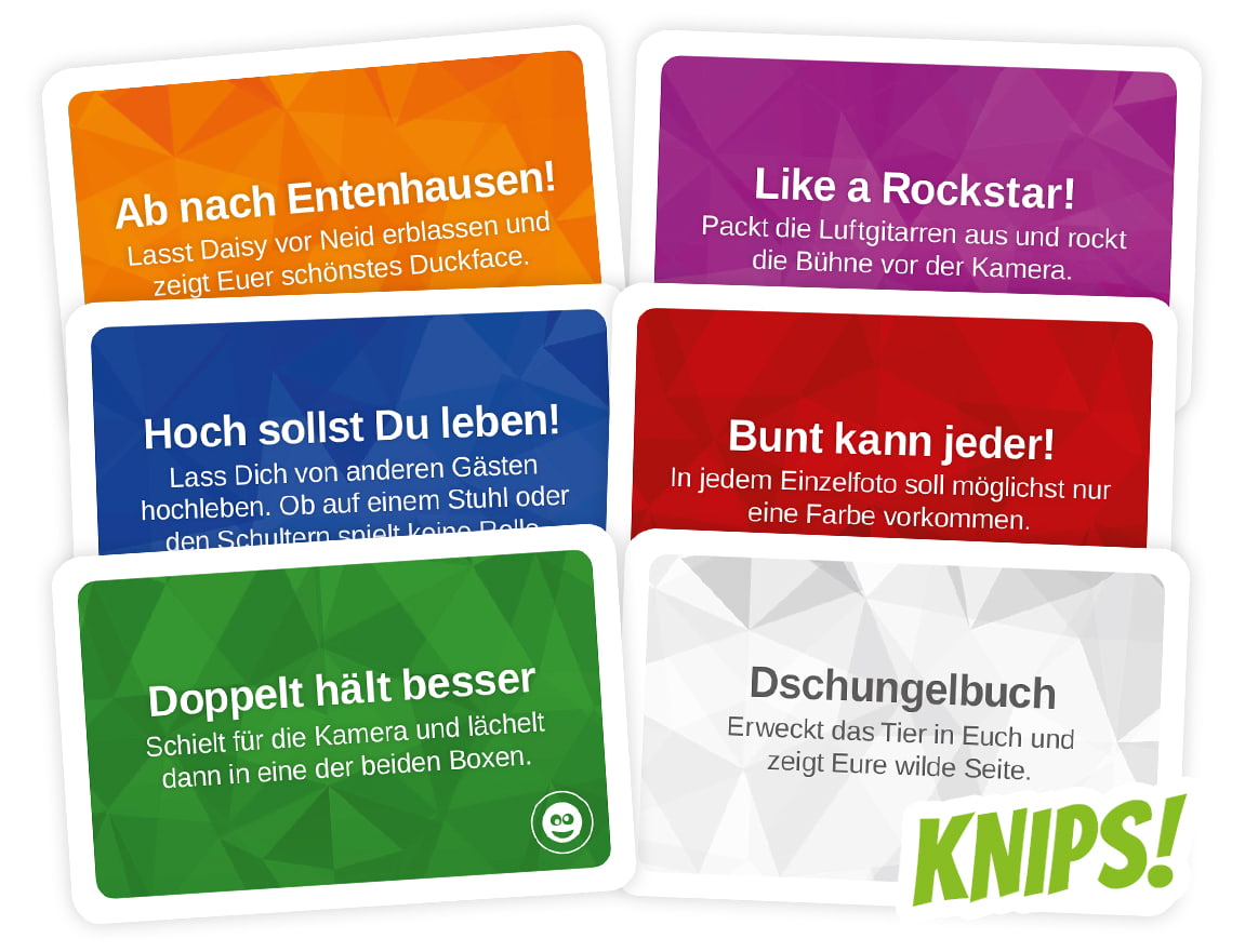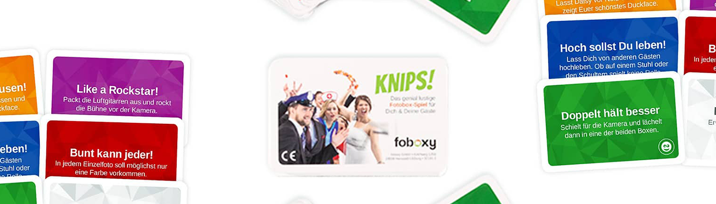 Kennst Du eigentlich schon KNIPS!, unser lustiges Kartenspiel? Es enthält 30 Aufgaben, die Du und Deine Gäste vor der Kamera lösen können. Keine Idee für die nächste Fotoserie? Kein Problem! Ziehe einfach eine Karte und lass Dich inspirieren. Das Kartenspiel erhälst Du automatisch mit jeder foboxy Fotobox. Du findest es bei den foboxy Requisiten. Aus den Aufgaben können witzige Fotobox Spiele gemacht werden. Wir zeigen Dir heute ein paar Einsatzmöglichkeiten für unser Fotospiel.
