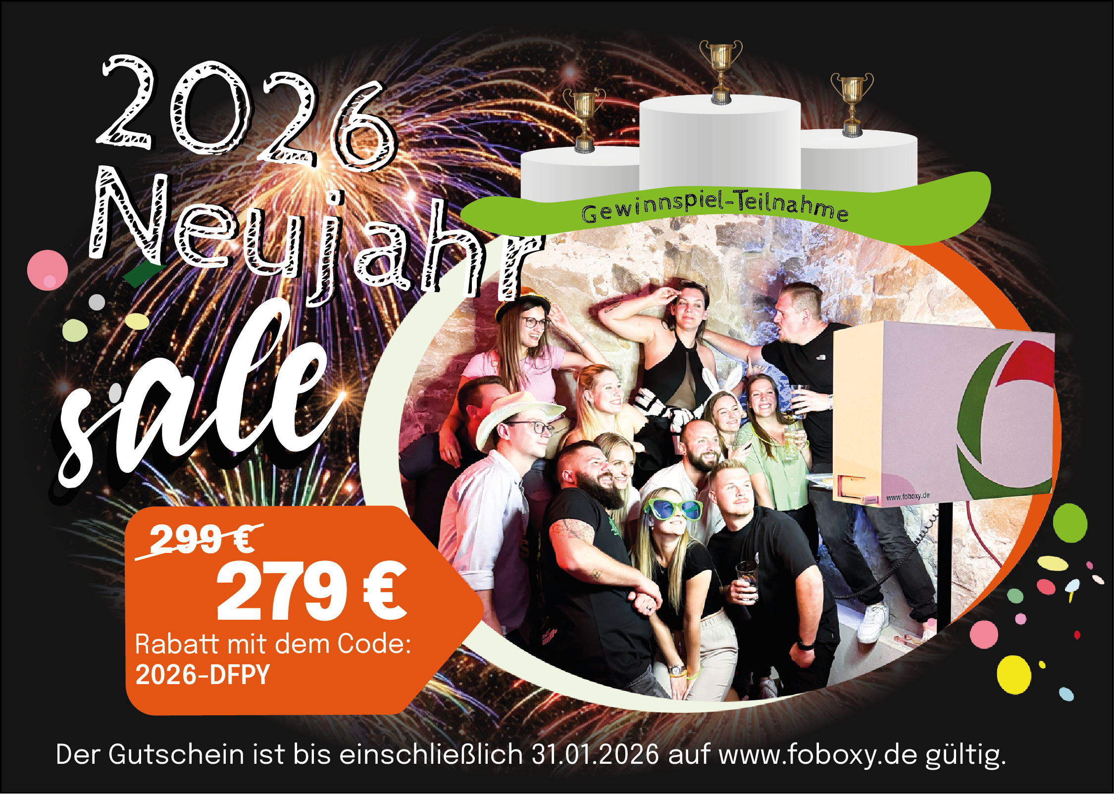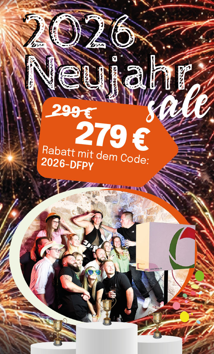 Mit jeder tatsächlichen Fotobox-Buchung (keine Anfragen) zwischen 01.01.2026 und 31.01.2026 landest Du automatisch im Lostopf für unser großes Neujahrsgewinnspiel. Jede Buchung = 1 Los!