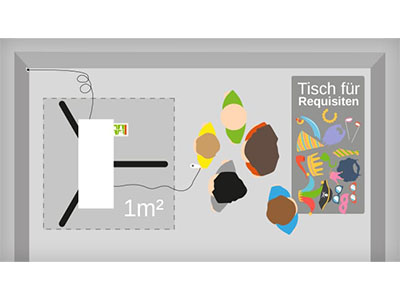 Durch die kompakte Bauweise der foboxy Fotobox braucht ihr nur einen Quadratmeter Platz, um die Box vollständig aufzubauen. Natürlich müsst ihr noch ein wenig Zusatzfläche für die Gäste einplanen, aber das kann notfalls auch ein Durchgang sein. Die Requisiten legt ihr dann einfach auf einem kleinen Tisch unter der Fotobox aus.