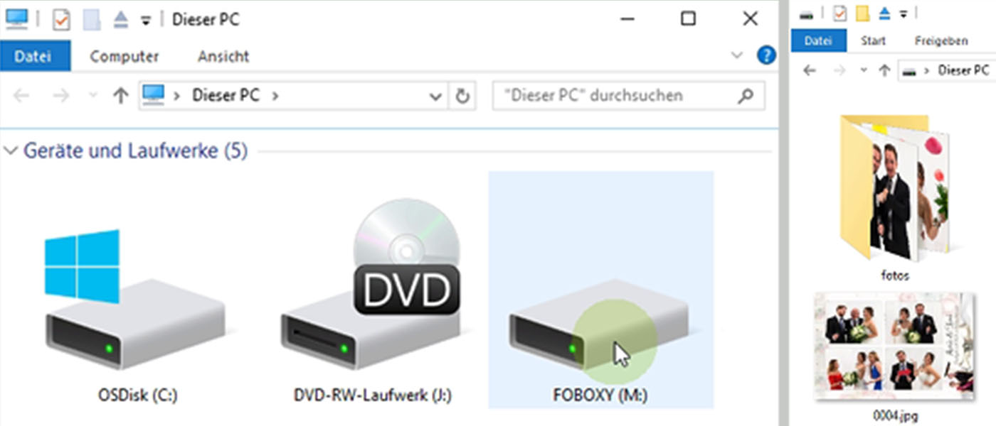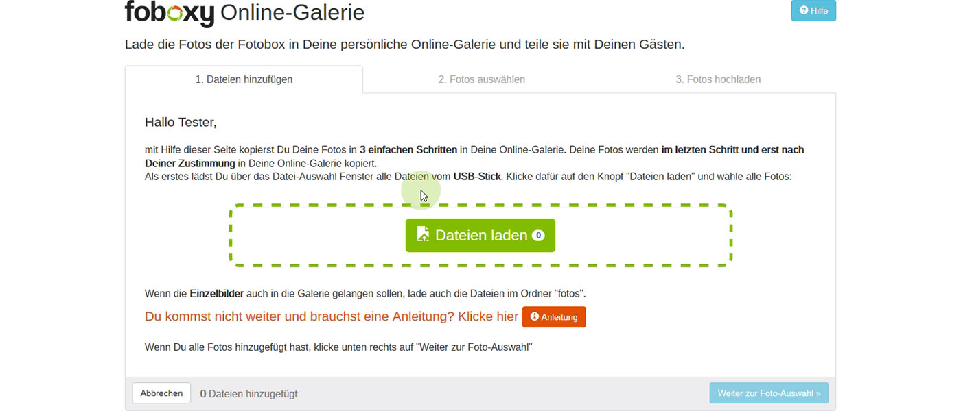 Als nächstes müssen die Foto-Dateien vom USB-Stick geladen werden. Die Fotos werden noch nicht in die Fotobox Galerie kopiert. Das passiert erst im letzten Schritt und erst nach Deiner Zustimmung. Du kannst entweder nur die Fotoserien hochladen, oder auch die Einzelfotos dazu – Deine Galerie hat keine Beschränkung. Klicke auf den Knopf „Dateien laden“. Es öffnet sich ein Fenster, in dem die Dateien ausgewählt werden können. Suche dafür zunächst den USB-Stick. Das Laufwerk findest Du unter „Dieser PC“ bzw. „Computer“ (Windows) und heißt „FOBOXY„. Die Namen der Foto-Dateien enthalten alle vier Ziffern und die Endung „.jpg“ – also z.B. „0004.jpg“. Ziehe einen Kasten um alle Dateien oder wähle eine Datei an und drücke Strg + A um alle Dateien auszuwählen.