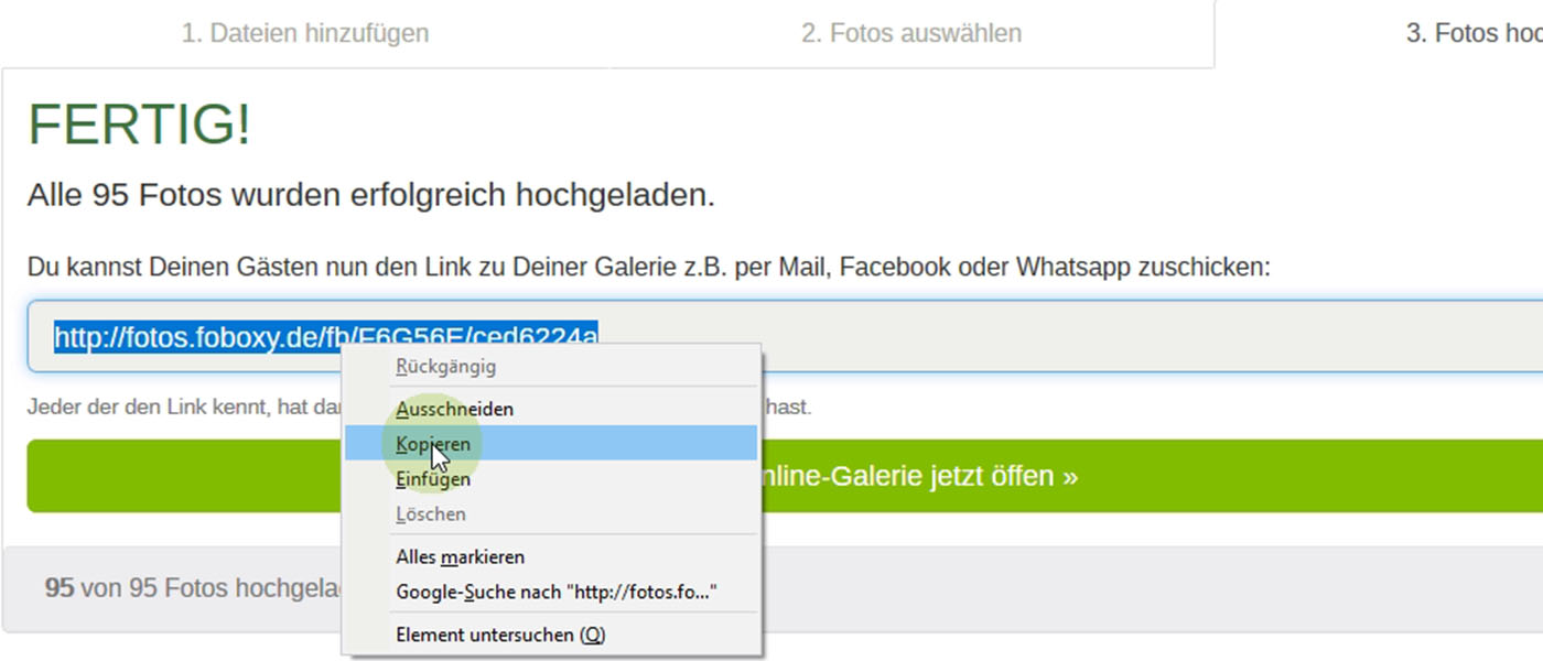 Wenn alle Fotos hoch geladen wurden zeigt Dir die Seite automatisch den Link zu Deiner Online-Galerie an. Du kannst diesen mit Strg + C oder einem Rechtsklick „Kopieren“ und per Facebook, E-Mail oder WhatsApp an Deine Gäste schicken.