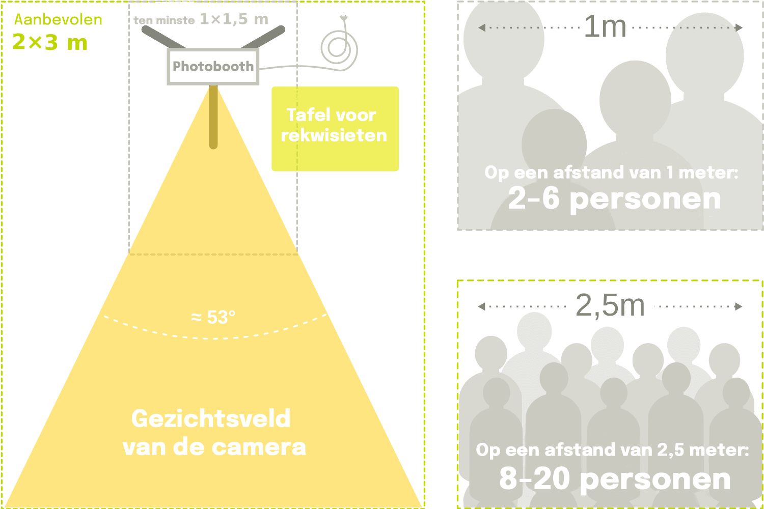 De photobooth zelf neemt niet meer dan 1×1 meter in beslag en staat midden op het statief. Hoe meer ruimte er voor de photobooth is, hoe meer mensen er op de foto kunnen. De breedte van de beelduitsnede komt overeen met de afstand tot de camera. Op een afstand van één meter is de beelduitsnede ook één meter breed.